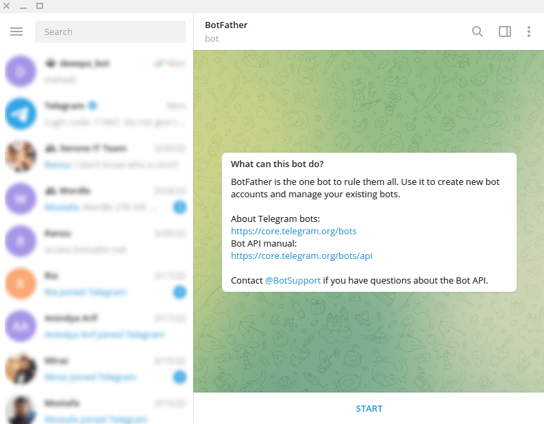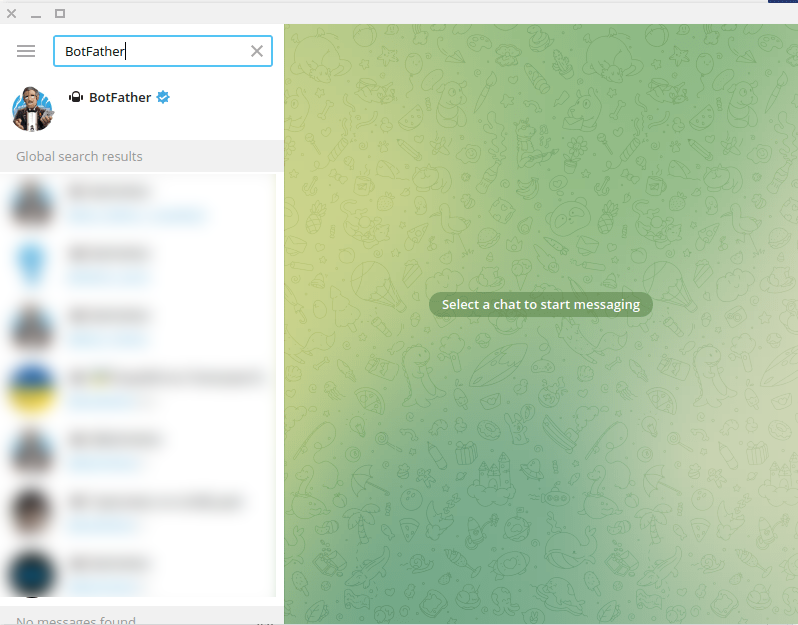 To build a Telegram bot with VECTRA CX, first, open your Telegram App. Then in the search bar of the app, search with the ‘BotFather’ keyword. Then select the verified BotFather account.